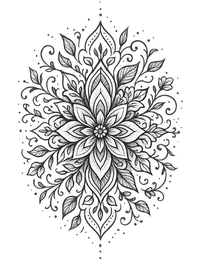 Die Tattoovorlage zeigt ein wunderschönes, florales Mandala mit detaillierten Blüten und geschwungenen Linien, die harmonisch ineinanderfließen. Die feinen Details und die symmetrische Anordnung der Elemente machen es zu einem idealen Design für Liebhaber von Schwarz-Weiß-Tattoos.