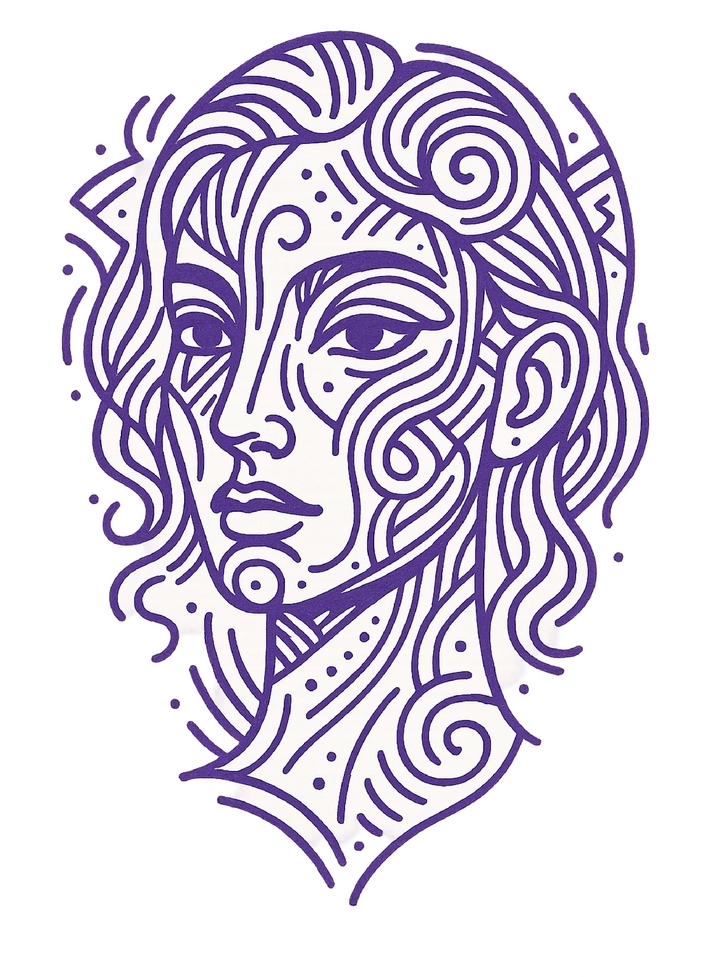 Die Tattoovorlage zeigt ein kunstvolles, abstraktes Gesicht, das durch geschwungene Linien und Details hervorsticht. Die violette Farbgebung verleiht der Vorlage eine kreative Note und macht sie zu einem einzigartigen Kunstwerk für Tattoos.