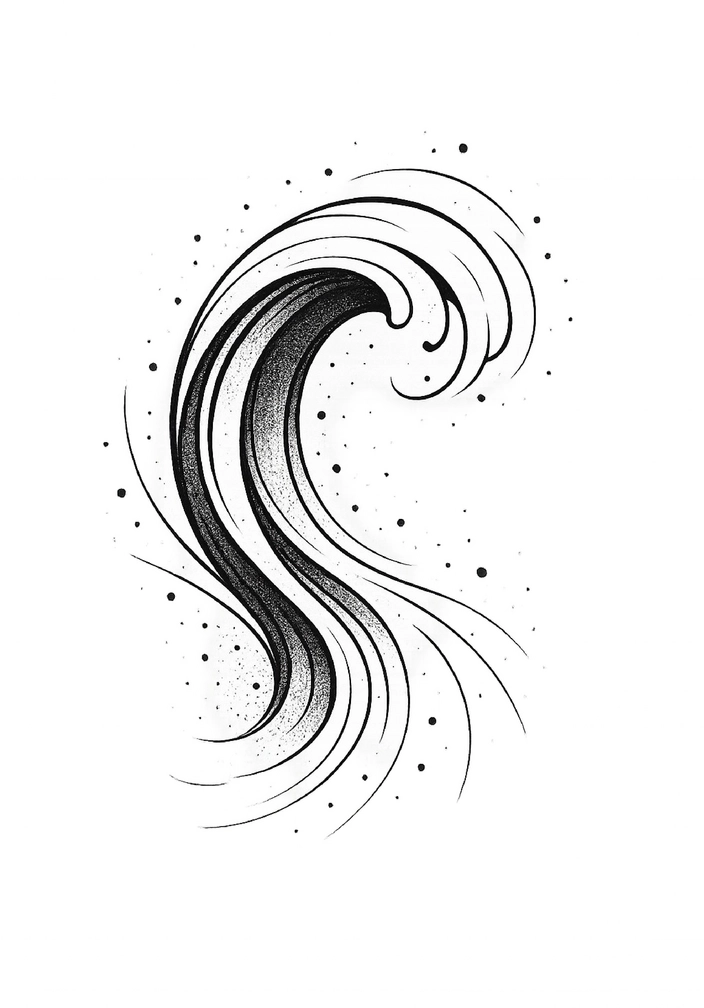 Diese Tattoovorlage zeigt eine künstlerisch gestaltete Welle, die durch fließende Linien und sanfte Kurven besticht. Die Verwendung von Schwarz-Weiß-Elementen und feinen Punkten verleiht dem Design eine dynamische und ansprechende Optik. Ideal für alle, die die Kraft und Eleganz des Wassers in Form eines Tattoos festhalten möchten.