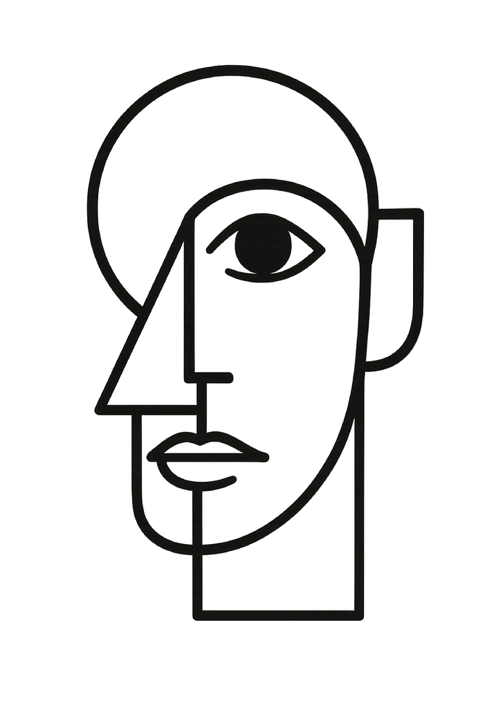 Die Tattoovorlage zeigt ein stilisiertes, abstraktes Gesicht, das durch geometrische Formen und klare Linien definiert ist. Die Kombination aus verschiedenen Formen und der monochrome Farbgebung vermittelt ein modernes und künstlerisches Gefühl. Ideal für diejenigen, die ein einzigartiges und minimalistisches Tattoo suchen.