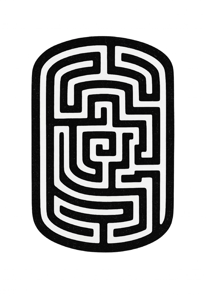Die Tattoovorlage zeigt ein komplexes, abstraktes Labyrinth in Schwarz-Weiß, das durch geschwungene Linien und geometrische Formen besticht. Dieses Design eignet sich hervorragend für diejenigen, die ein einzigartiges und kreatives Tattoo suchen, das sowohl ästhetisch ansprechend als auch symbolisch bedeutungsvoll ist.