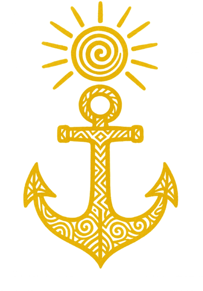 Diese Tattoovorlage zeigt einen stilisierten Anker mit abstrakten Mustern und einer Sonne.