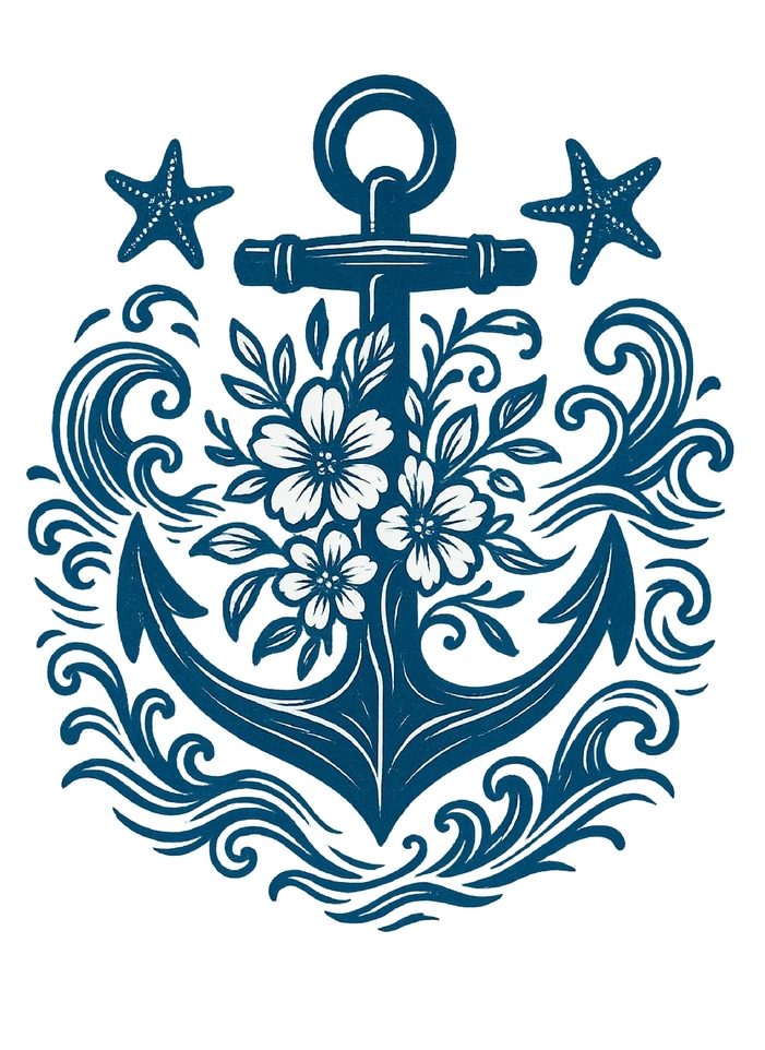 Diese Tattoovorlage zeigt einen stilisierten Anker, der mit floralen Elementen und Meereswellen verziert ist. Umgeben von Seesternen, strahlt das Design eine maritime Atmosphäre aus und eignet sich besonders für Tattoos auf dem Oberarm.