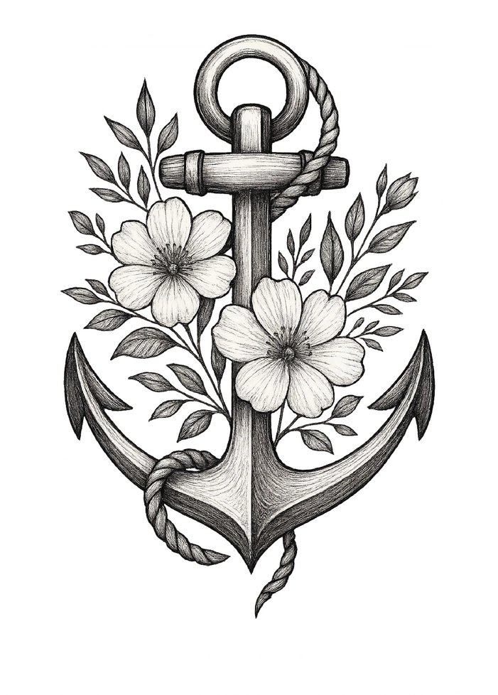 Diese Tattoovorlage zeigt einen Anker umgeben von floralen Elementen und symbolisiert Stärke und Verbundenheit.