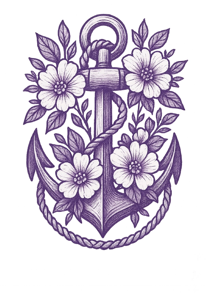 Diese Tattoovorlage zeigt einen Anker, umgeben von floralen Elementen, die Stabilität und Schönheit symbolisieren.