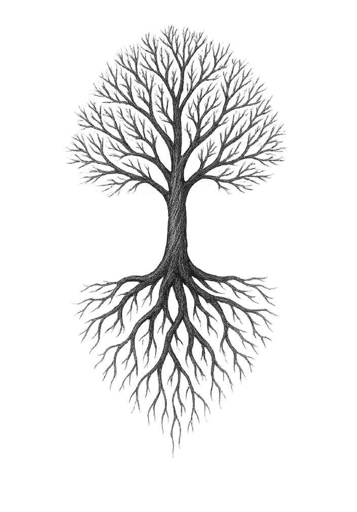 Ein kunstvoller Baum mit Wurzeln als Tattoo-Design für den Unterarm.