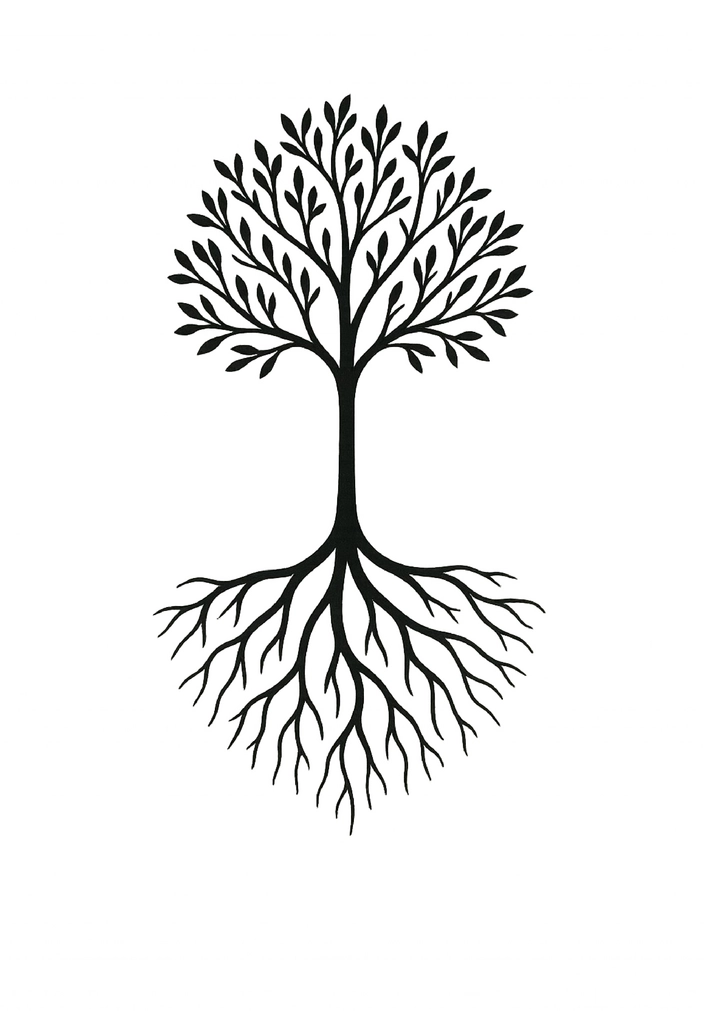 Minimalistische Tattoovorlage eines Baumes mit Wurzeln in elegantem Schwarz-Weiß.