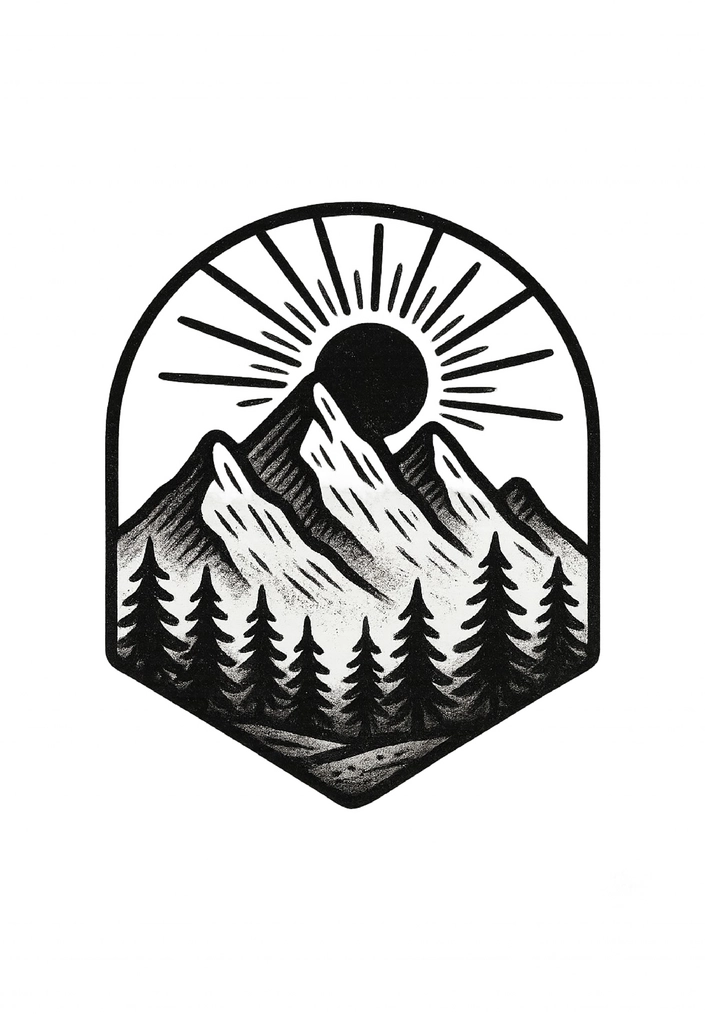 Diese Tattoovorlage zeigt eine beeindruckende Berglandschaft mit schneebedeckten Gipfeln, umgeben von Tannenbäumen und einem strahlenden Sonnenaufgang. Die Komposition vermittelt ein Gefühl von Freiheit und Abenteuer, ideal für Natur- und Outdoor-Liebhaber.