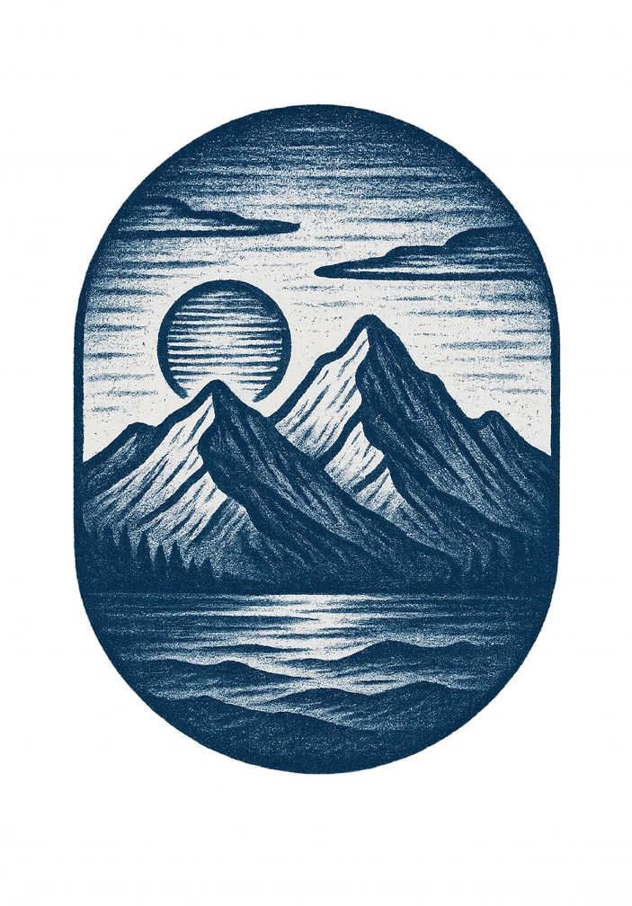 Diese Tattoovorlage zeigt eine beeindruckende Landschaft mit majestätischen Bergen und einer strahlenden Sonne. Die harmonische Komposition vermittelt eine friedliche Atmosphäre, perfekt für Naturliebhaber.