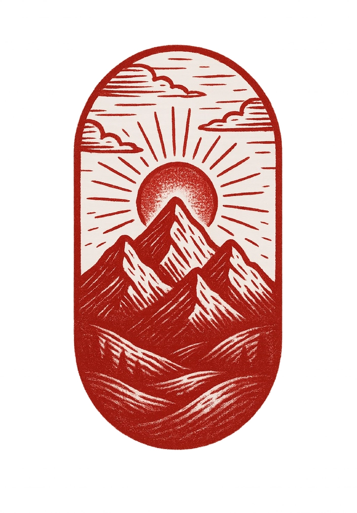 Diese Tattoovorlage zeigt eine stilisierte Berglandschaft mit einem Sonnenuntergang im Hintergrund. Die schneebedeckten Gipfel und sanften Hügel vermitteln ein Gefühl von Ruhe und Freiheit, ideal für Natur- und Abenteuerliebhaber.