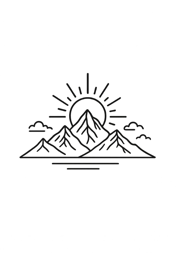 Diese Tattoovorlage zeigt ein minimalistisches Bergpanorama mit einer strahlenden Sonne im Hintergrund. Die feinen Linien und die klaren Formen vermitteln ein Gefühl von Freiheit und Verbundenheit mit der Natur. Ideal für alle, die eine harmonische und zeitlose Tätowierung suchen.