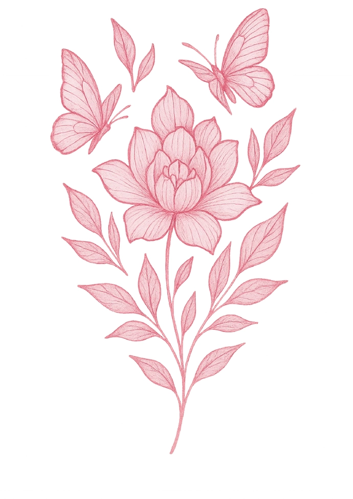 Diese Tattoovorlage zeigt eine stilisierte Blume, umgeben von zarten Schmetterlingen und Blättern. Das sanfte Design in Pink vermittelt ein Gefühl von Freiheit und Schönheit. Ideal für Frauen, die ein natürliches und elegantes Tattoo suchen.
