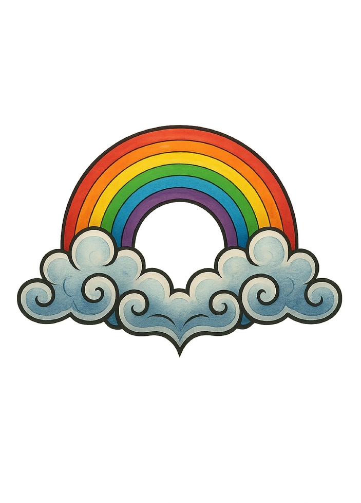 Die Tattoovorlage zeigt einen bunten Regenbogen, der von Wolken umgeben ist. Die leuchtenden Farben und die verspielte Darstellung machen dieses Tattoo zu einem fröhlichen Motiv, das Optimismus und Freude symbolisiert.