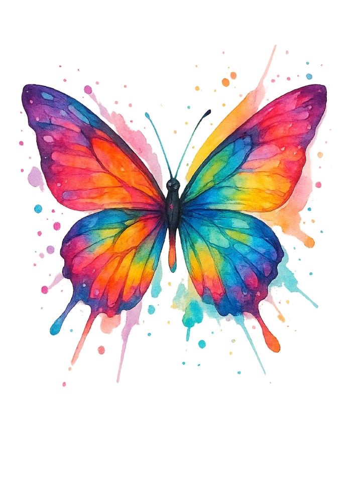 Dieses Tattoo zeigt einen bunten Schmetterling in lebendigen Wasserfarben. Die Farben verlaufen harmonisch und verleihen dem Design eine lebendige Optik. Ideal für Tattoo-Liebhaber, die ein auffälliges und künstlerisches Motiv suchen.