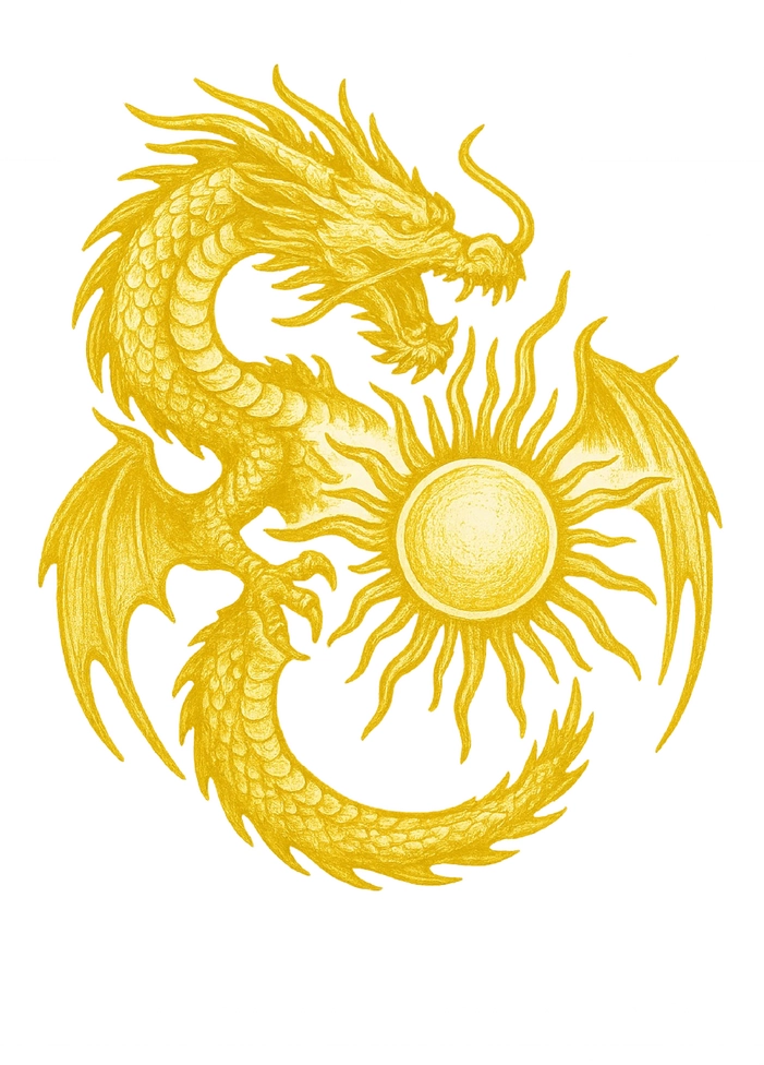 Eine eindrucksvolle Tattoovorlage mit einem Drachen, der eine Sonne umschlingt.