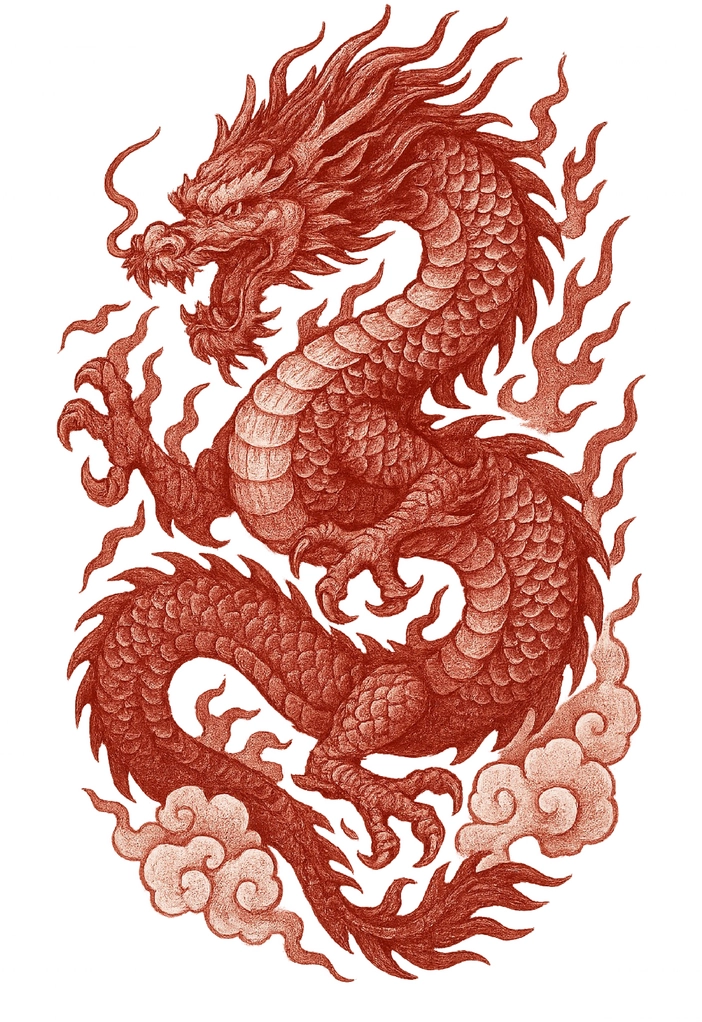 Diese Tattoovorlage zeigt einen majestätischen Drachen, der von Flammen umgeben ist. Die detaillierte Darstellung umfasst geschwungene Linien und kräftige Schuppen, die das Bild lebendig wirken lassen. Der Drache ist umgeben von Wolken und symbolisiert Stärke und Macht.