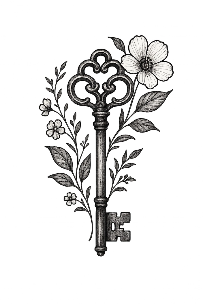 Diese Tattoovorlage zeigt einen kunstvoll gestalteten Schlüssel, umgeben von floralen Elementen. Die Kombination aus schwarzer Tinte und detailreichen Blumen verleiht dem Motiv eine elegante Ausstrahlung, die sowohl mystisch als auch verspielt wirkt. Ideal für Frauen, die Natur und Symbolik schätzen.