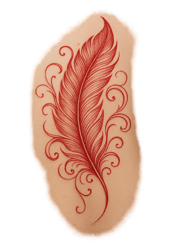 Die Tattoovorlage zeigt eine kunstvoll gestaltete Feder in einem lebhaften Rotton. Die geschwungenen Linien und filigranen Details verleihen dem Design eine elegante und dynamische Ausstrahlung. Dieses Tattoo eignet sich hervorragend für Frauen, die etwas Einzigartiges und Stilvolles suchen.