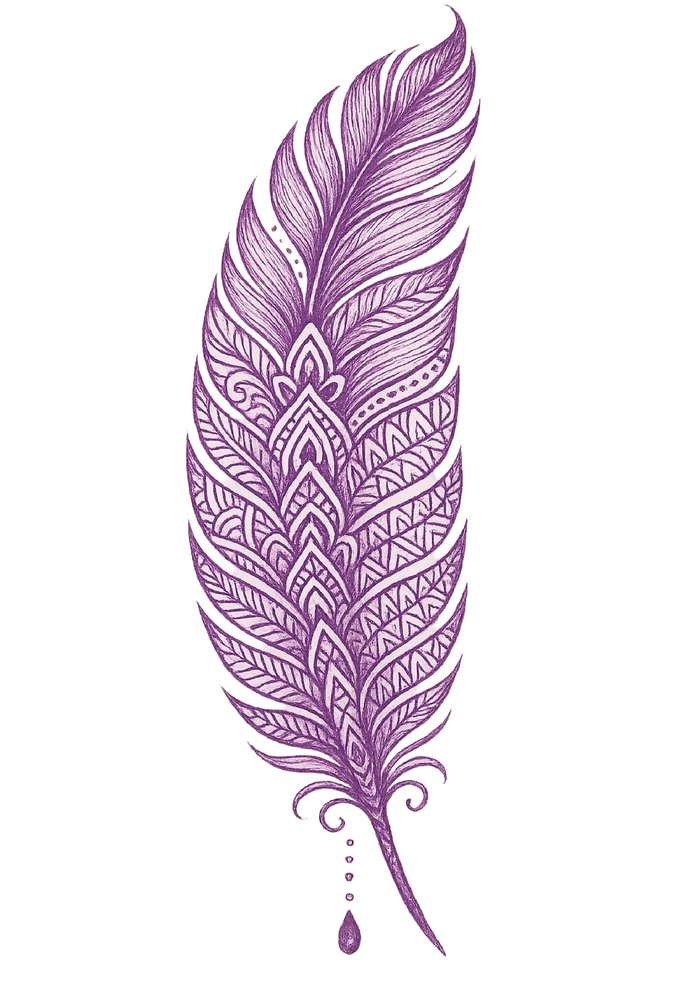 Die Tattoovorlage zeigt eine elegante Feder mit geometrischen Mustern in einem sanften Lila-Ton. Die detaillierte Verzierung und die fließenden Linien vermitteln ein Gefühl von Leichtigkeit und Freiheit und machen dieses Design zu einer idealen Wahl für Tattoo-Liebhaber, die etwas Einzigartiges suchen.