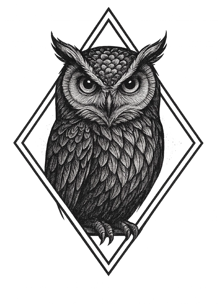 Detailreiche Eule in geometrischem Rahmen als Tattoo-Vorlage.