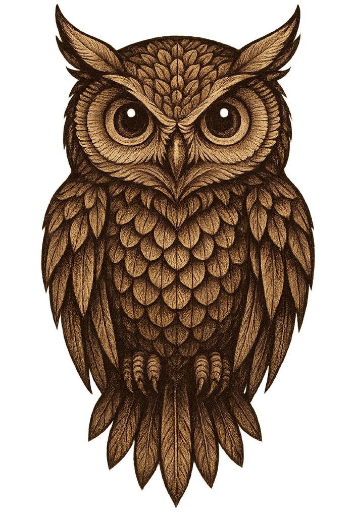 Tattoovorlage Eule mit großen Augen und detaillierten Federn