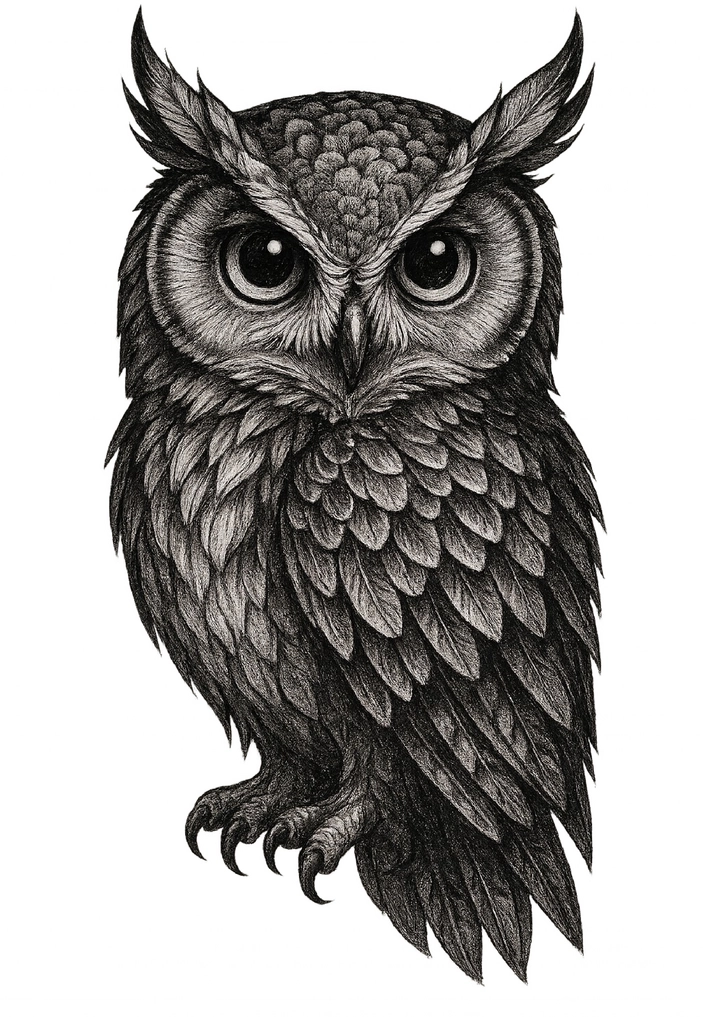 Tattoovorlage Eule mit großen Augen und detailreichem Gefieder