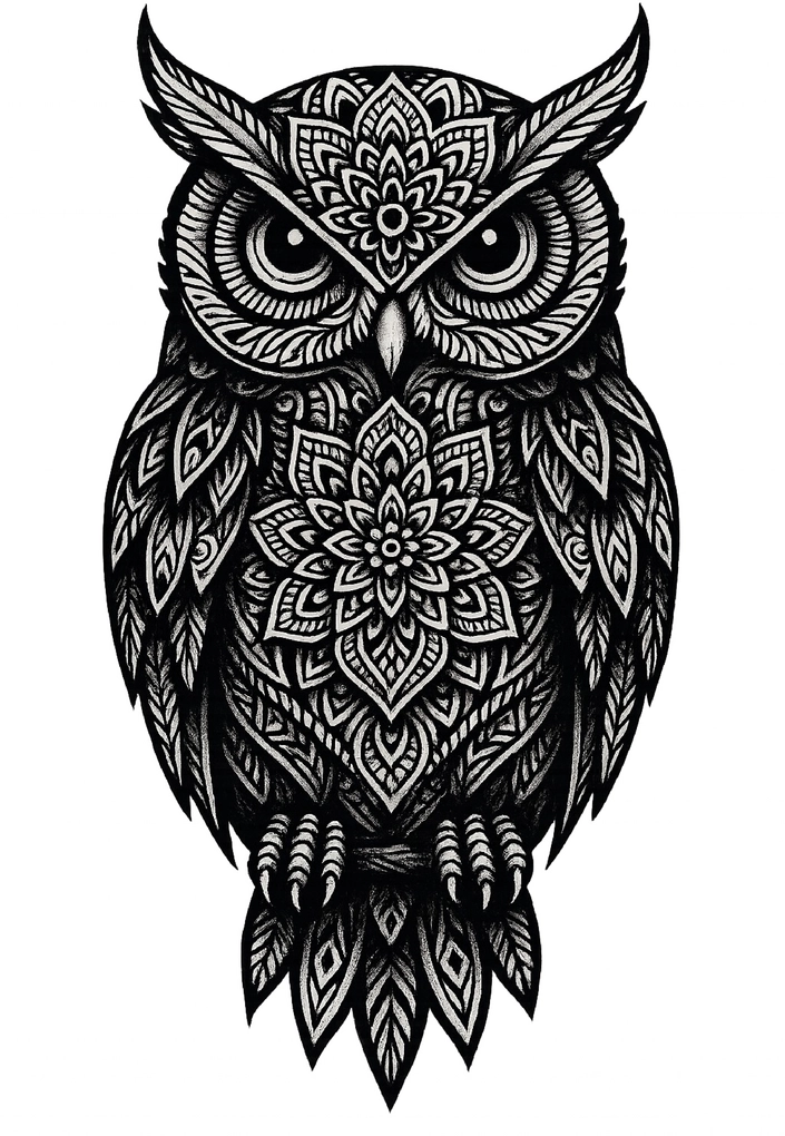 Diese Tattoovorlage zeigt eine kunstvoll gestaltete Eule, die mit einem Mandala-Muster verziert ist. Die detaillierte Darstellung verbindet Tier- und geometrische Motive in einem harmonischen Design. Ideal für alle, die ein einzigartiges Tattoo suchen.