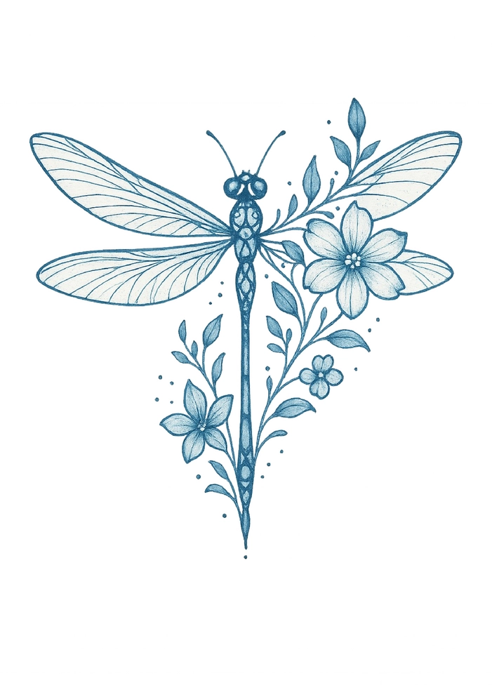 Tattoovorlage mit einer filigranen Libelle und floralen Elementen in ansprechendem Design.