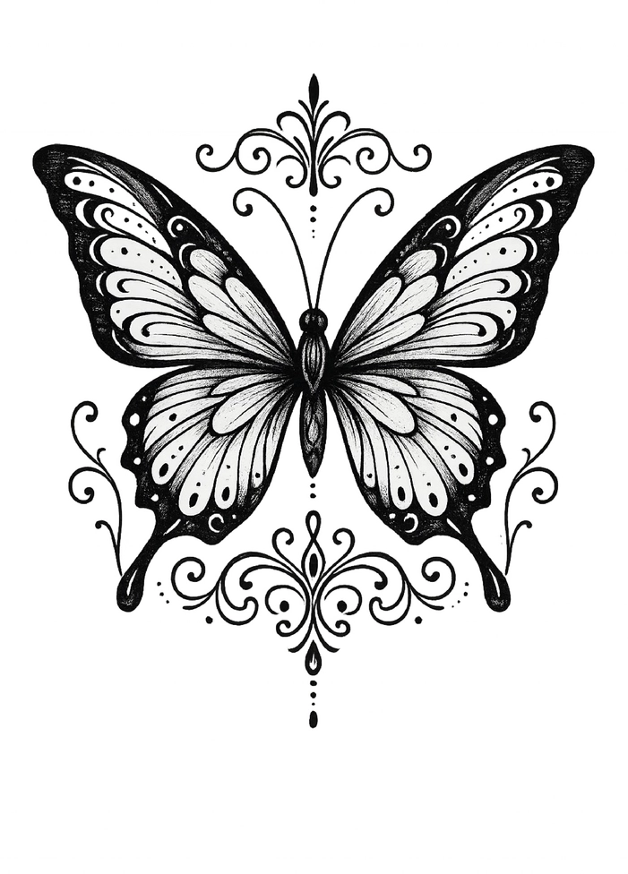 Diese Tattoovorlage zeigt einen filigranen Schmetterling, der von eleganten Ornamenten umgeben ist. Die schwarz-weiße Darstellung hebt die Details und die Schönheit des Designs hervor, was es zu einer idealen Wahl für Tattoos auf dem Rücken macht.