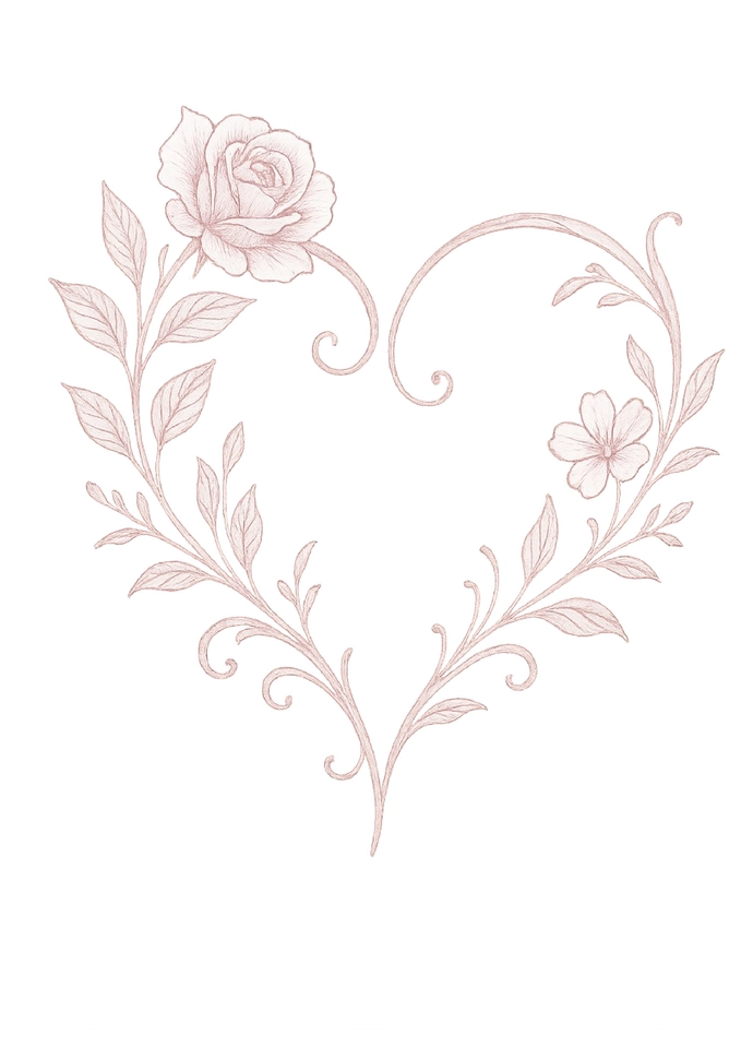 Diese Tattoovorlage zeigt ein elegantes Herzdesign, das mit filigranen floralen Elementen verziert ist. Die zarten Rosen und Blätter umrahmen das Herz und verleihen der Vorlage eine romantische Note. Ideal für Frauen, die ein kreatives und ästhetisches Tattoo suchen.
