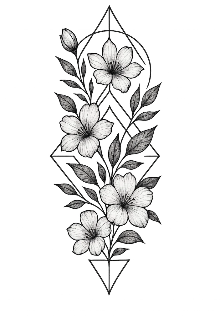 Diese Tattoovorlage zeigt eine elegante Komposition aus blühenden Blumen und geometrischen Formen. Die feinen Linien und die harmonische Anordnung der floralen Elemente verleihen dem Design eine moderne Ästhetik. Ideal für Frauen, die eine künstlerische und natürliche Darstellung auf Haut wünschen.