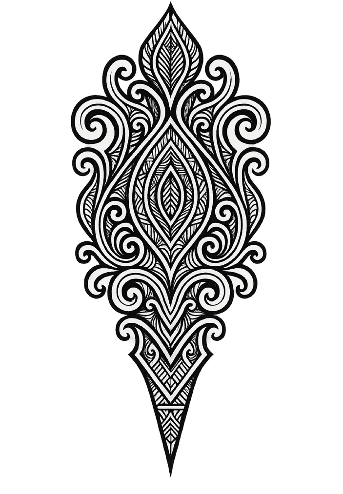 Diese Tattoovorlage zeigt ein kunstvolles Ornament mit geschwungenen Linien und blattähnlichen Motiven, die eine harmonische und dynamische Form schaffen. Das Design ist klar und detailliert, ideal für ein Waden- oder Unterschenkel-Tattoo, das sowohl ästhetisch ansprechend als auch symbolisch tiefgründig ist.
