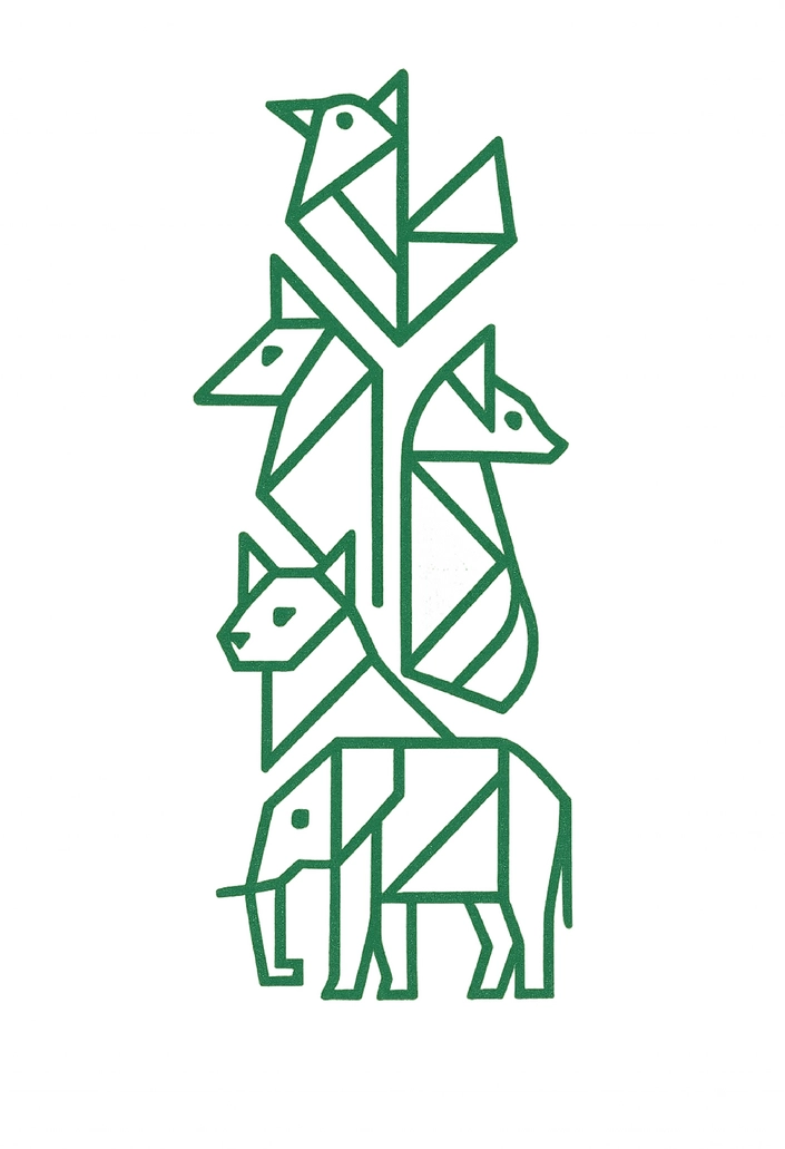 Diese Tattoovorlage präsentiert eine stilisierte Darstellung von Tieren in geometrischen Formen. Auf dem Bild sind ein Vogel, mehrere Füchse und ein Elefant zu sehen, die harmonisch angeordnet sind. Die klaren Linien und die minimalistische Gestaltung verleihen der Vorlage eine moderne Ästhetik, die sich hervorragend für ein Oberarmtattoo eignet.