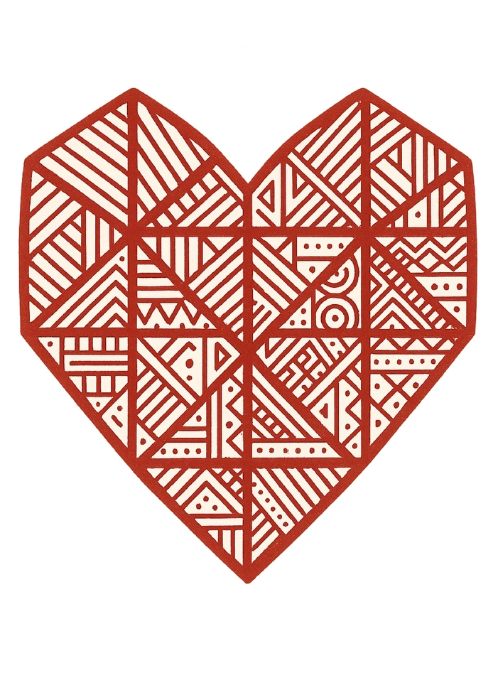 Die Tattoovorlage zeigt ein geometrisches Herz, das aus verschiedenen Mustern und Linien besteht. Die Kombination aus den geometrischen Formen und der Farbgebung verleiht dem Design eine moderne und künstlerische Note.