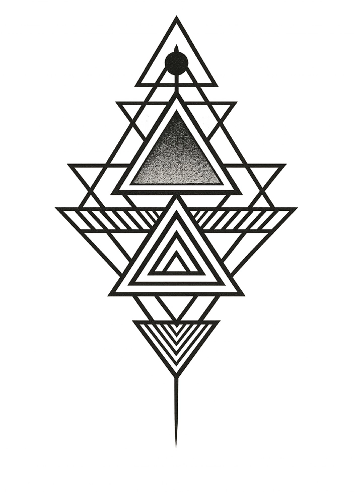 Das geometrische Tattoo zeigt eine ansprechende Anordnung von Triangeln und Linien, die in harmonischer Weise miteinander verbunden sind. Diese Vorlage eignet sich ideal für Tattoos auf dem Oberarm, insbesondere für Männer, die ein modernes und stilvolles Design suchen.