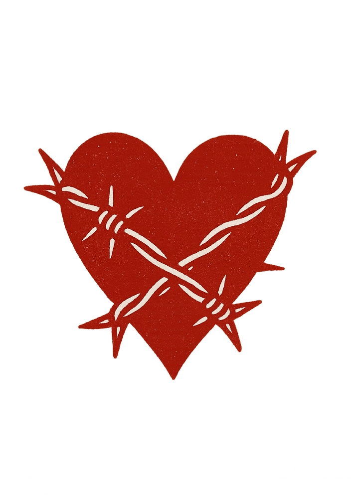 Stilisiertes Herz mit Draht umwickelt, symbolisiert Leidenschaft und Schmerz.