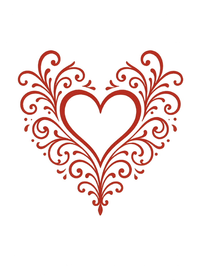 Diese Tattoovorlage zeigt ein stilvolles, geschwungenes Herz, umgeben von eleganten, floralen Ornamenten. Die kunstvollen Linien verleihen dem Design einen romantischen und verspielten Charakter, ideal für alle, die ihre Liebe ausdrücken möchten. Die rote Farbe hebt die Details hervor und macht das Tattoo zu einem Blickfang.