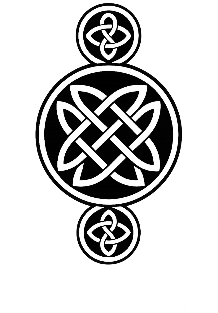 Diese Tattoovorlage zeigt ein kunstvolles, keltisches Knotendesign, das durch seine symmetrischen Formen und die Kombination von Kreisen besticht. Die zentrale Figur ist von zwei kleineren Kreisen umgeben, die ebenfalls keltische Muster aufweisen, was dem Gesamtbild eine harmonische und ausgeglichene Ästhetik verleiht.