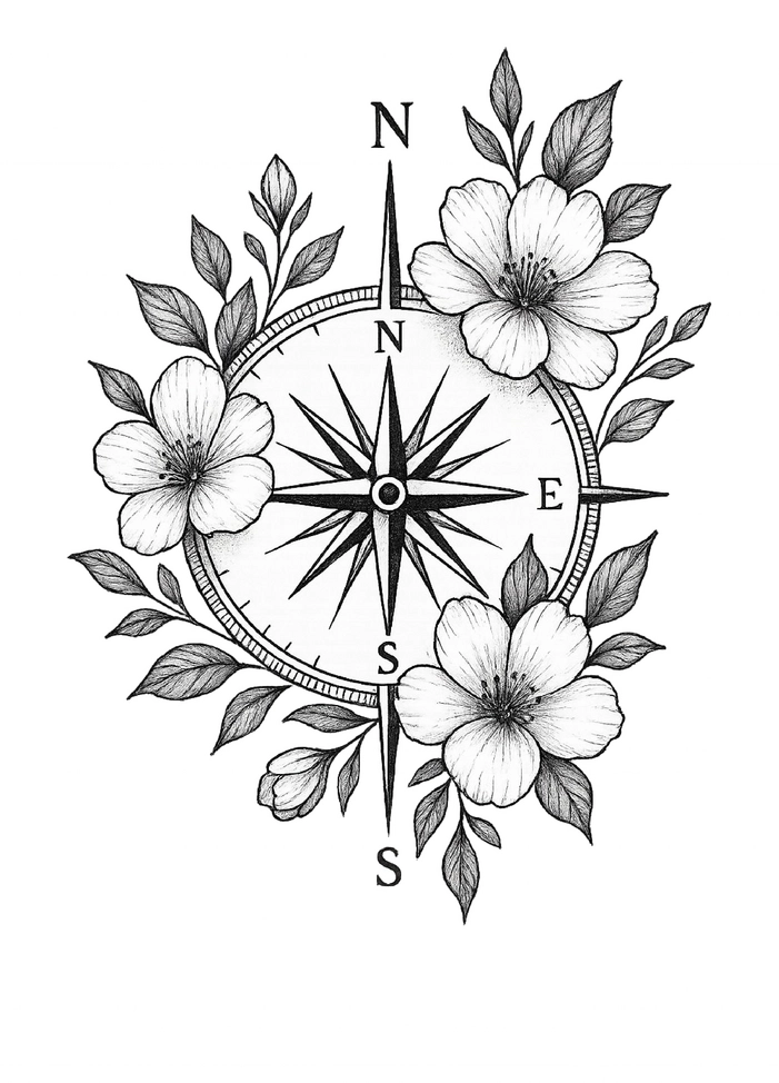Diese Tattoovorlage zeigt einen kunstvoll gestalteten Kompass, umgeben von floralen Akzenten. Die Kombination aus dem Kompass und den Blumen verleiht dem Tattoo eine harmonische und zugleich abenteuerliche Ausstrahlung, ideal für alle, die ihre Leidenschaft für Reisen und die Natur ausdrücken möchten.