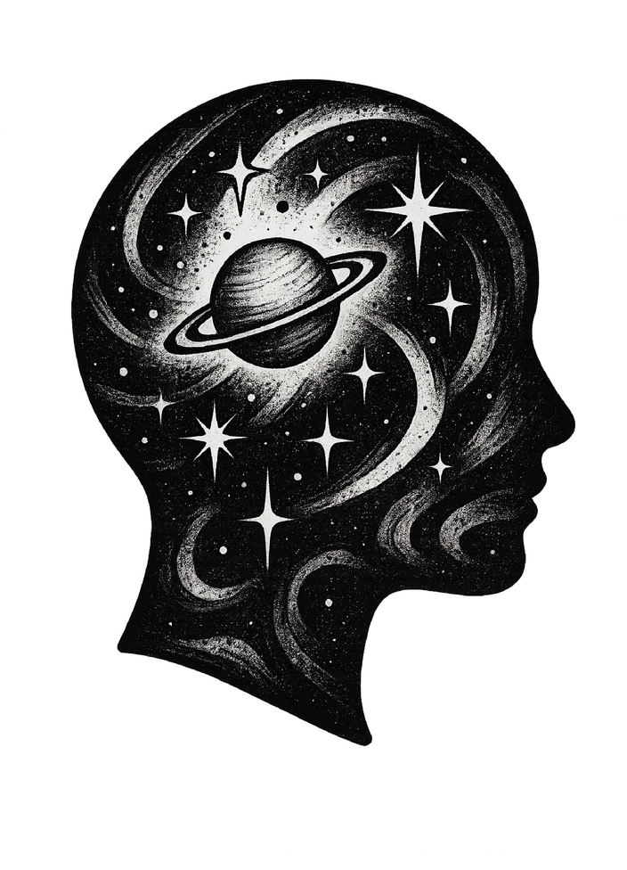 Diese Tattoovorlage zeigt eine kreative Darstellung eines Kopfes, der mit einem Universum gefüllt ist. Der Planet Saturn und leuchtende Sterne verleihen dem Design eine mystische Tiefe und symbolisieren die Unendlichkeit des Denkens und der Träume.