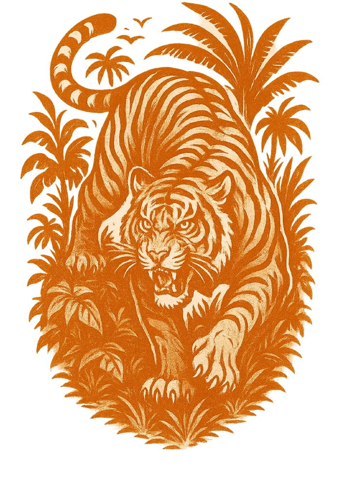 Diese Tattoovorlage zeigt einen kraftvollen Tiger, der durch dichte Pflanzen im Dschungel schleicht. Die detaillierten Schattierungen und die dynamische Pose des Tigers vermitteln ein Gefühl von Stärke und Wildheit. Umgeben von üppigem Grün und Palmen, ist der Tiger ein Symbol für Mut und Freiheit.