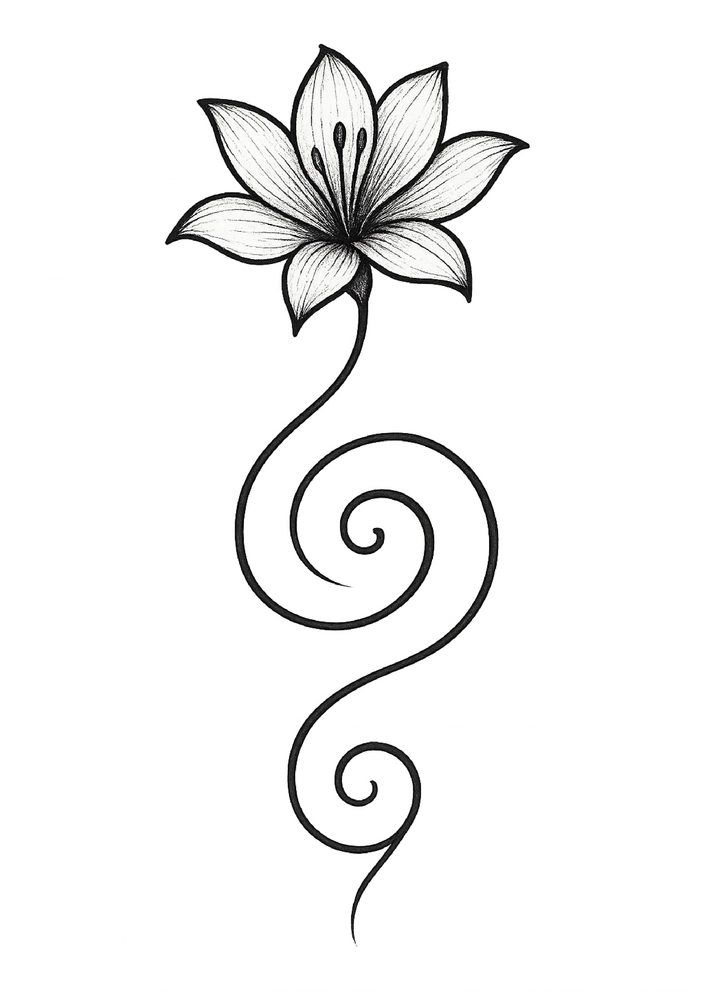 Das Tattoo zeigt eine künstlerische Darstellung einer Blume, die elegant in eine spiralförmige Linie übergeht. Die feinen Details und die geschwungene Form verleihen dem Design eine besondere Anmut.