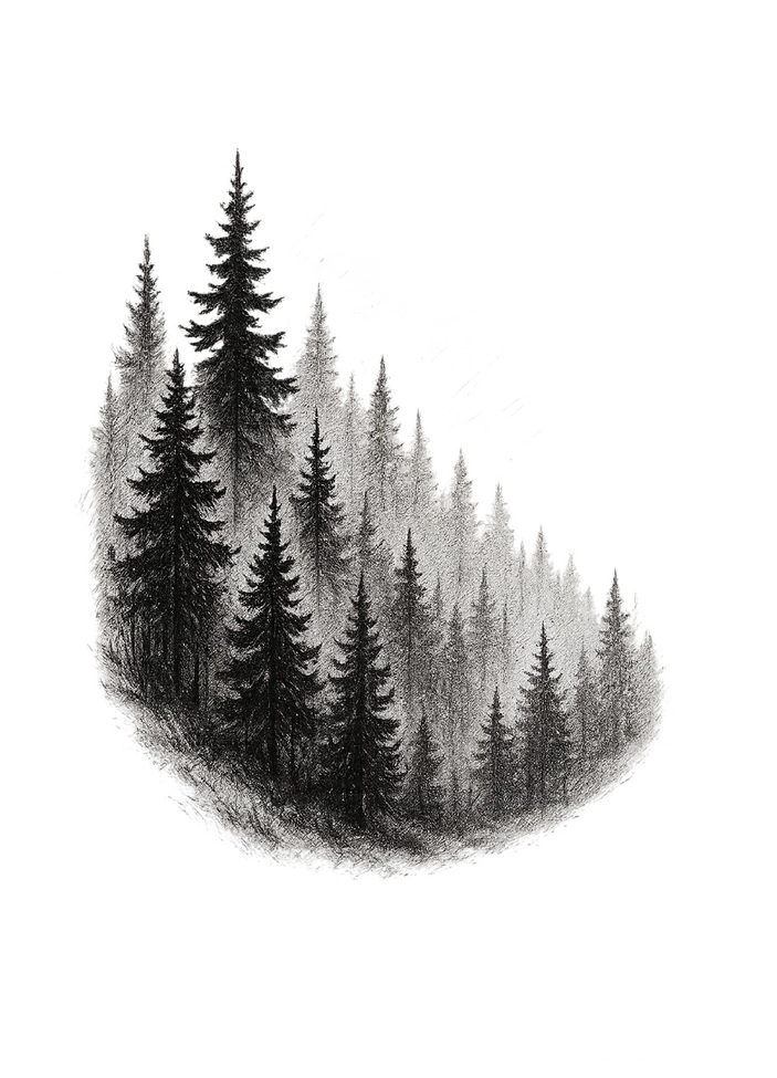 Die Tattoovorlage zeigt eine künstlerische Darstellung eines Waldmotivs mit verschiedenen Tannenbäumen. Die schwarz-weiße Ausführung vermittelt eine ruhige und harmonische Atmosphäre, die die Schönheit der Natur einfängt. Dieses Design ist ideal für Tattoo-Liebhaber, die eine Verbindung zur Natur suchen.