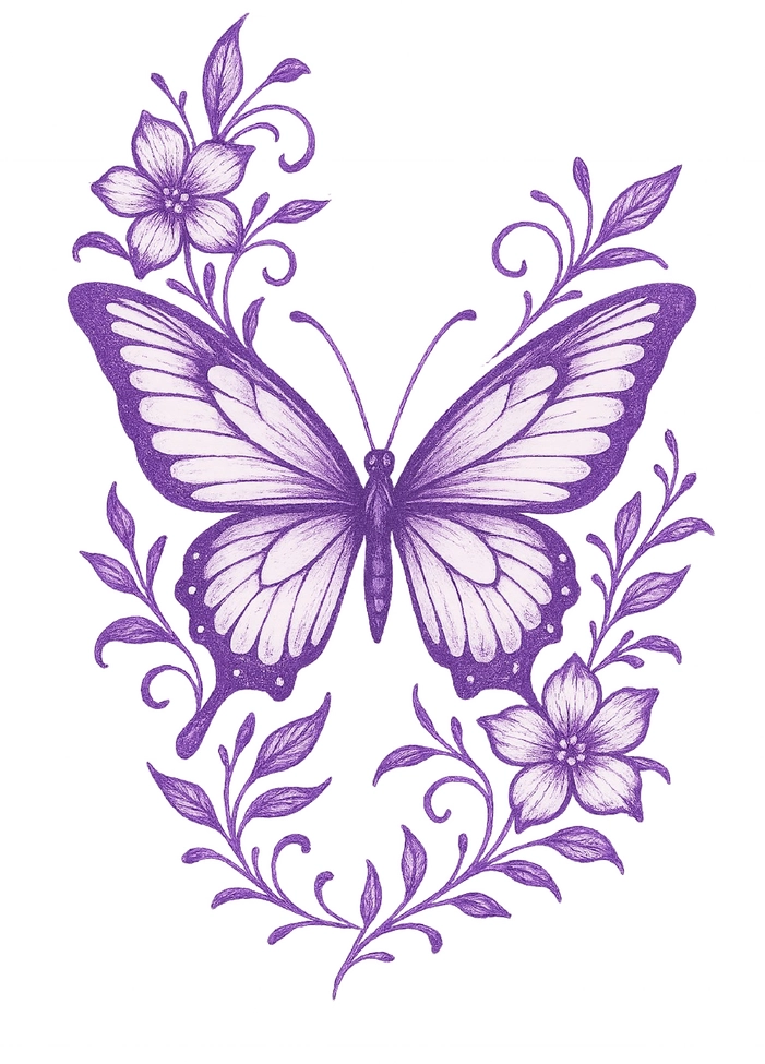 Diese Vorlage zeigt einen künstlerischen Schmetterling mit floralen Elementen in lila Farbtönen.