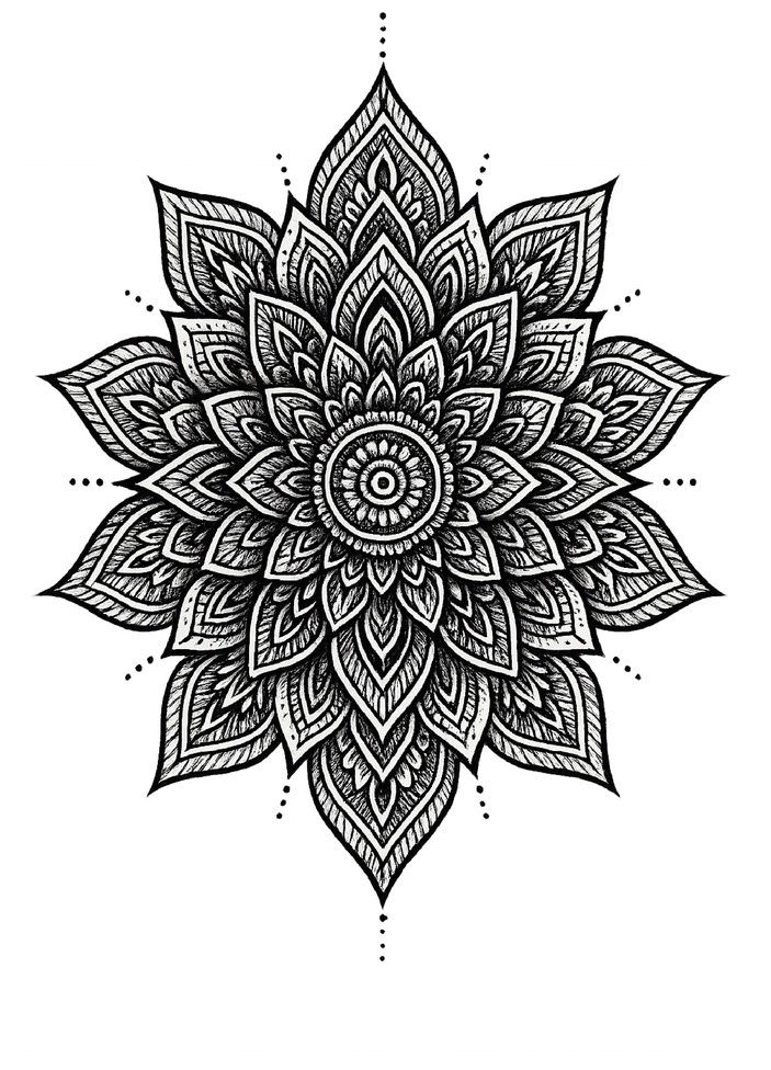 Diese Tattoovorlage zeigt ein kunstvolles Mandala, das aus vielen detaillierten, symmetrischen Formen besteht. Die feinen Linien und die komplexe Struktur machen dieses Tattoo zu einem beeindruckenden Kunstwerk, das sowohl ästhetisch ansprechend als auch spirituell bedeutungsvoll ist. Es eignet sich perfekt für den Nacken oder Hals, wo es seine volle Wirkung entfalten kann.