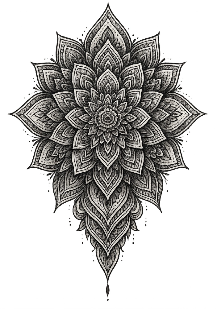 Die Tattoovorlage zeigt ein kunstvoll gestaltetes Mandala, das mit filigranen Details und symmetrischen Mustern beeindruckt. Die floralen Elemente und die harmonische Anordnung verleihen diesem Design eine spirituelle Note und eignen sich hervorragend für eine Rücken-Tattoo-Platzierung.