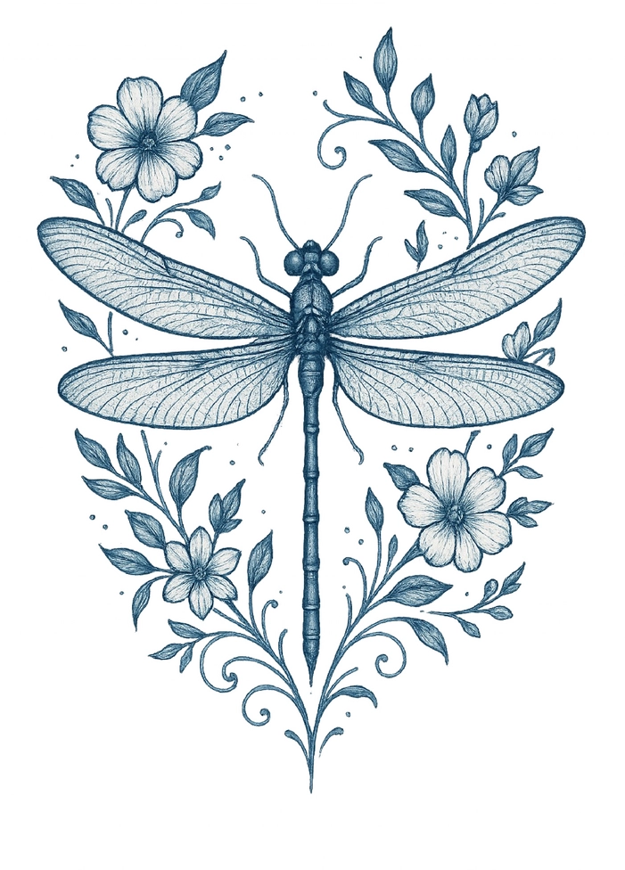 Tattoovorlage Libelle mit floralen Akzenten für Frauen