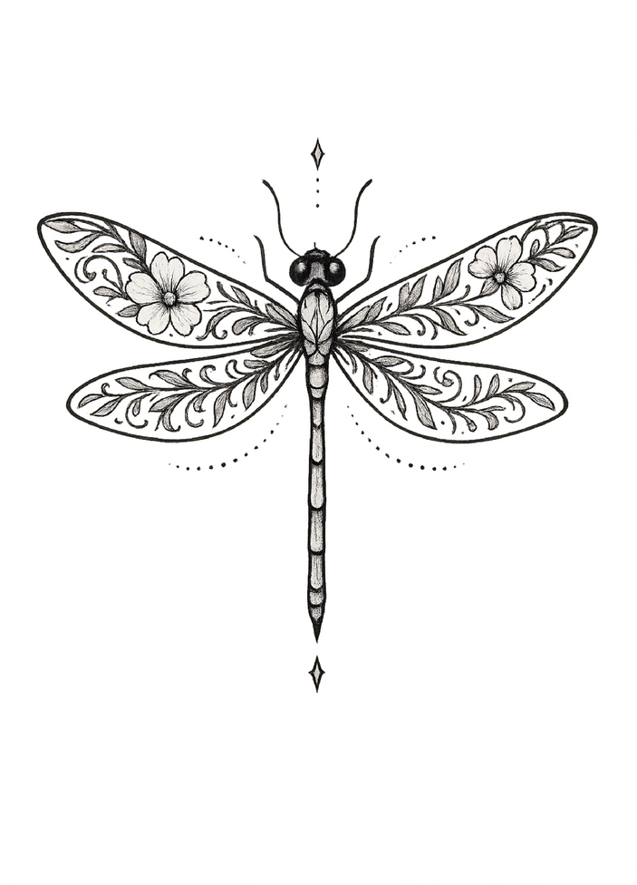 Stilvolle Tattoo-Vorlage einer Libelle mit floralen Elementen für Frauen.