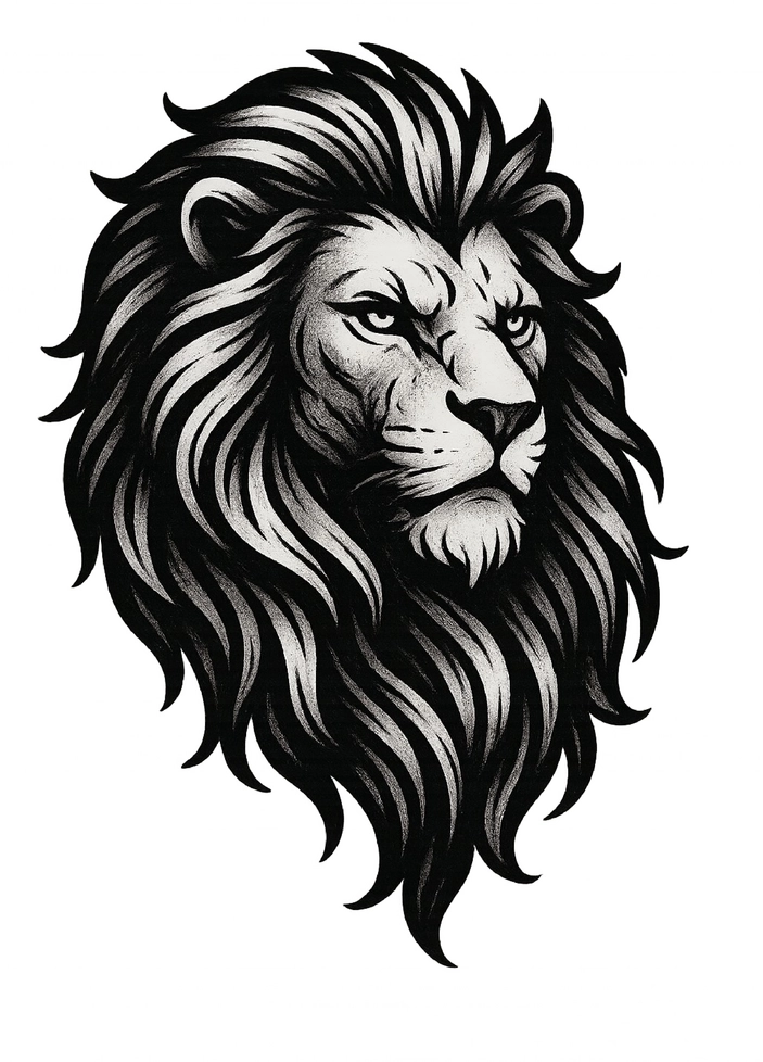 Die Tattoovorlage zeigt das majestätische Porträt eines Löwen mit detaillierter Mähne. Die kunstvolle Darstellung betont die Stärke und Anmut des Tieres und eignet sich hervorragend für ein Oberarmtattoo.