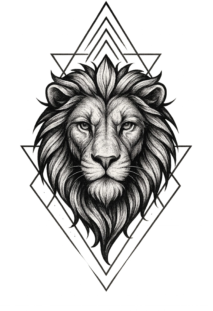 Diese Tattoovorlage zeigt einen majestätischen Löwenkopf, der in einem geometrischen Design eingebettet ist. Die feinen Details des Fells und der ausdrucksstarken Mimik verleihen dem Tattoo eine beeindruckende Präsenz. Ideal für Männer, die Stärke und Mut symbolisieren möchten.